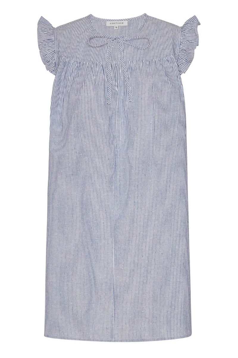 Den sødeste sommerkjole fra Continue! Den er løs i pasformen og har flæsedetaljer ved ærmerne. Den går ned i en v-udskæring og har samtidig sløjfedetalje ved halsen. Kjolen findes også i en rød stribe og er bare den perfekte sommerkjole efter vores smag!