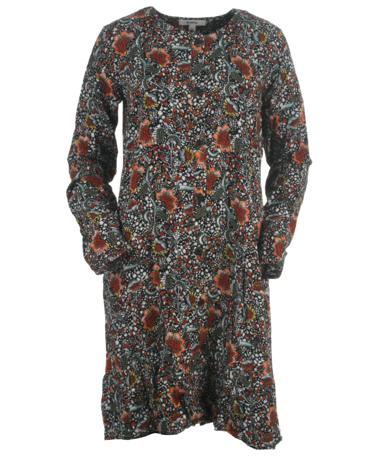 Garcia kjole, offblackMærke: GarciaFarve: SortMateriale: 100% viscoseVask: 30°Sort kjole med mønster fra GarciaLukkes med knapper på frontenAll-over hvid, orange, rød, grønne og gule mønster blomsterRund halsFlæse ved nederste kantKnælangLange ærmer med e
