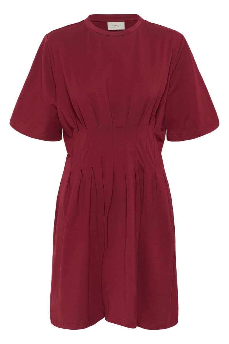 Kjolen er designet i en dyb bordeauxrød farve og har et enkelt, moderne udtryk med fine, feminine detaljer. Den har en rund halsudskæring og korte, let rummelige ærmer, som giver et afslappet og behageligt fald. Taljen er markeret med diskrete læg og syni