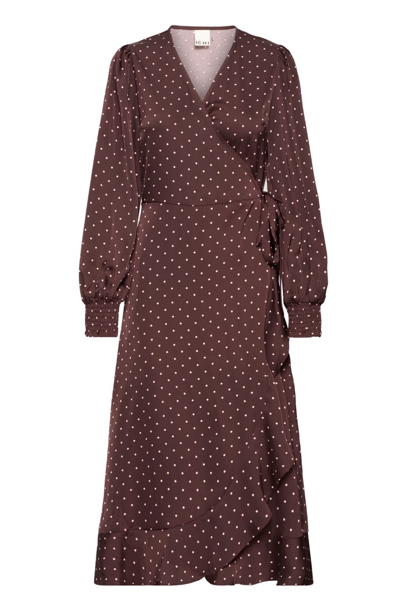 En smuk slå-om kjole fra Ichi er kommet i denne bordeaux farve med hvide prikker. Den er ammevenlig og lukkes i siden med en sløjfe. Det elegante snit gør også at den er nem at bruges sammen med et par stiletter til en fest. Men også fint il et par sandal