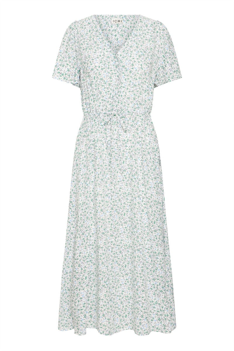 Den sødeste sommerkjole fra Ichi er kommet i blomstret print i grønne farver. Den er med bindbånd i taljen som nemt bruges til at give noget figur til stylen. Den er perfekt til hverdag med en sandal og så findes den også i røde farver.Â
