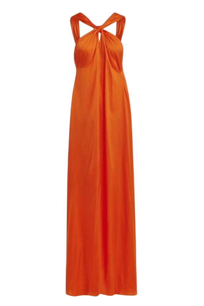 Lang kjole fra Essentiel Antwerp i en let og flydende kvalitet designet i en A-formet silhuet. Kjolen har halterneck med krydsede stropper, der samles i en knudedetalje foran, som giver et karakteristisk og moderne look. Under knuden ses en diskret åbning