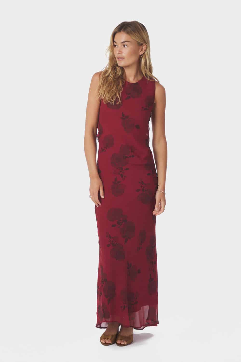 Denne lange kjole fra Neo Noir er designet i mørkerød dekoreret med små roser. Kjolen har en rund halsudskæring og er uden ærmer. Kjolen lukkes ved hjælp af en lynlås bagpå.