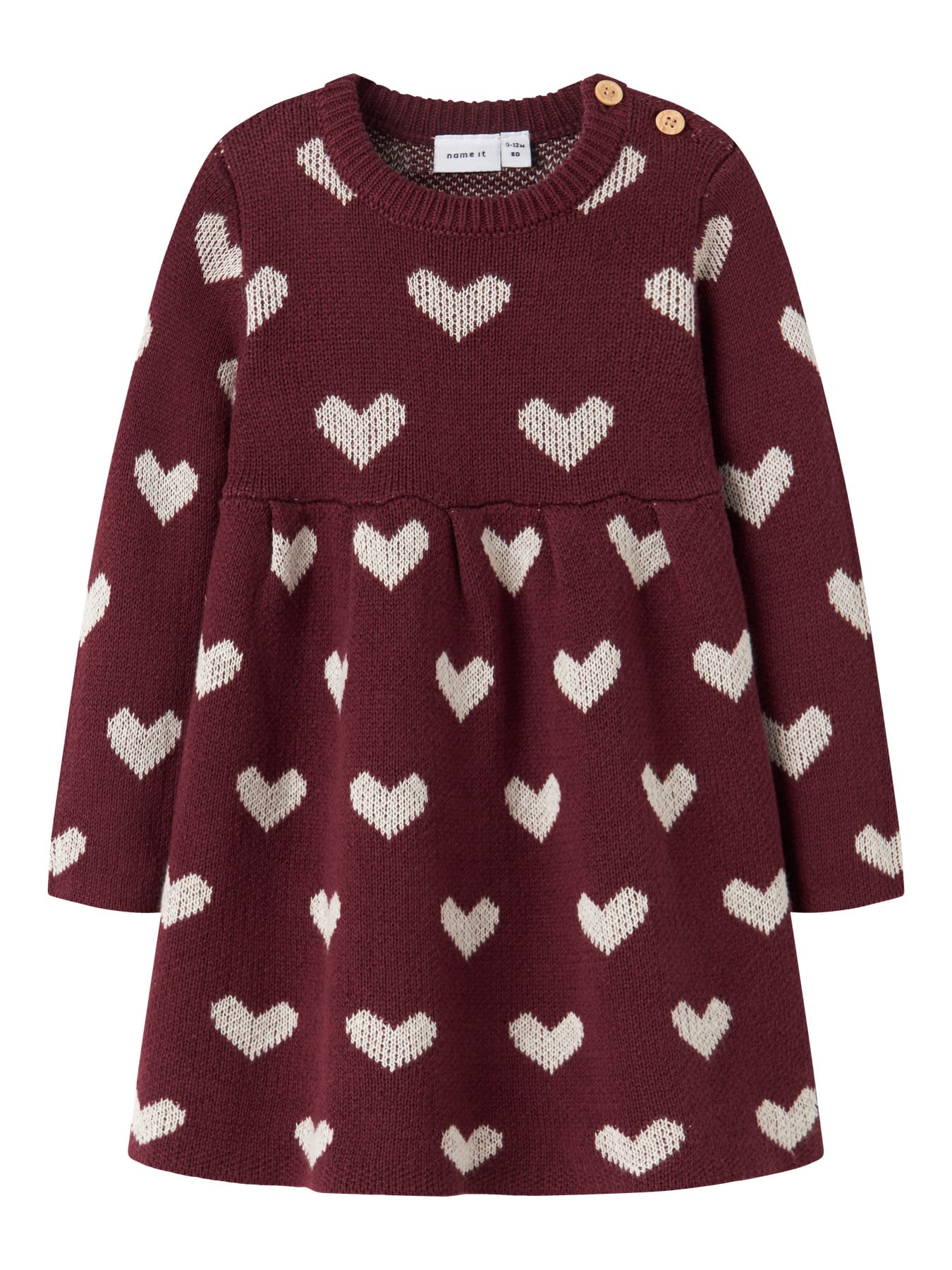 Mega sød strik kjole fra Name it. Den er i super smuk bordeau farve med print af hjerter. Den er med trykknapper i skulderen og blød kvalitet.