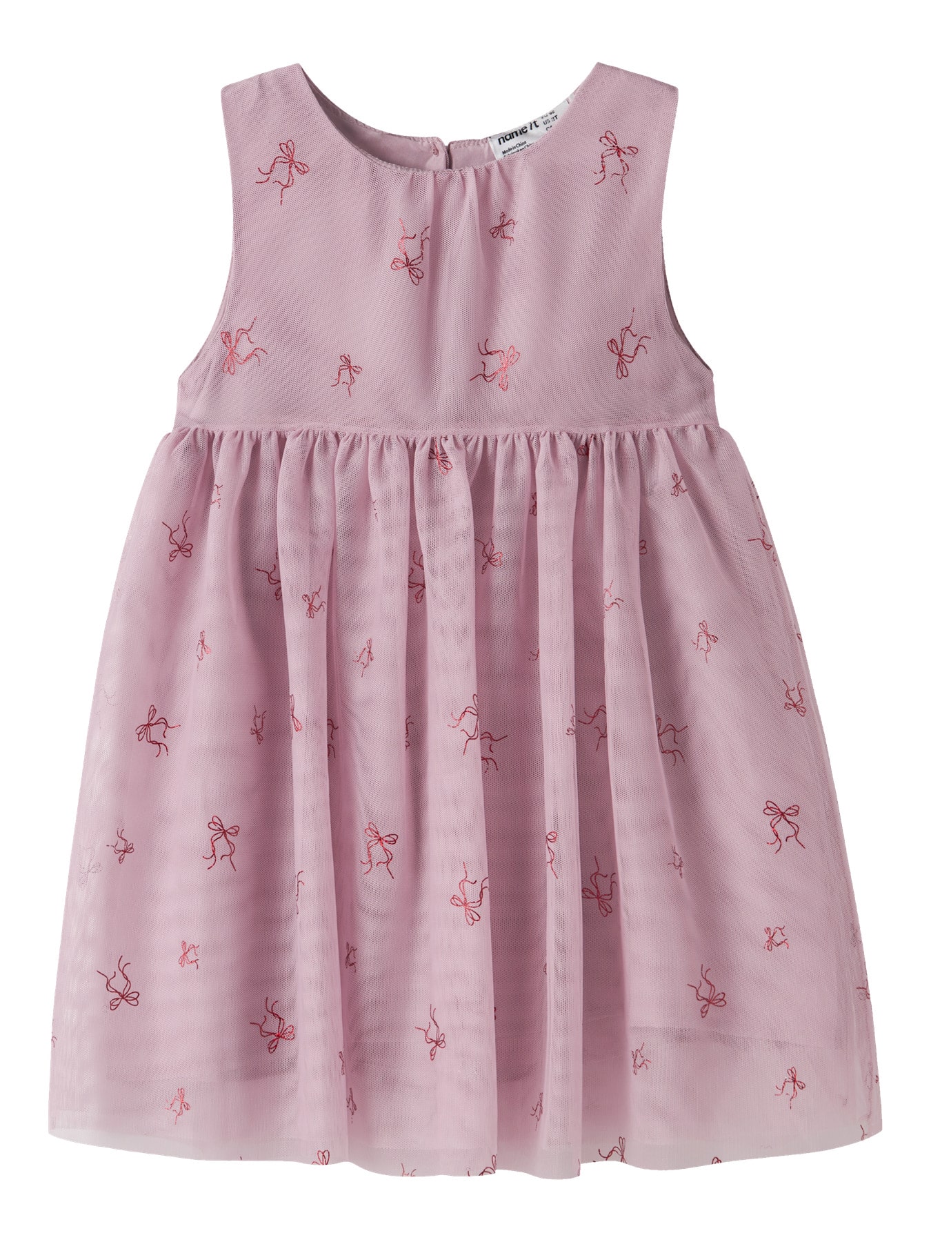 Ultra smuk tyl kjole fra Name It. Kjolen er med flere lag tyl, i en smuk rosa farve og med print af sløjfer. Den har et fint snit, er uden ærmer og lukkes med en enkelt knap i nakken.