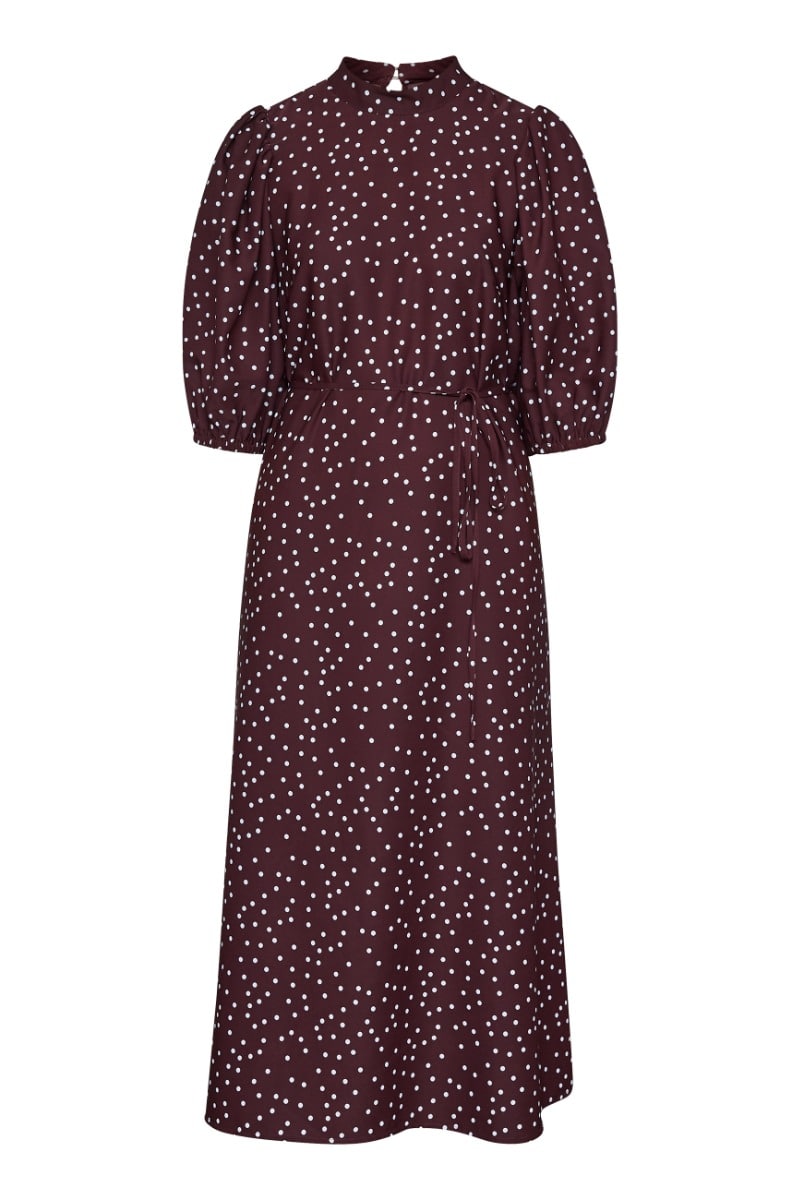 En smuk kjole fra Sisters Point i en bordeaux farve med prikker i hvid. Den er løs i pasformen