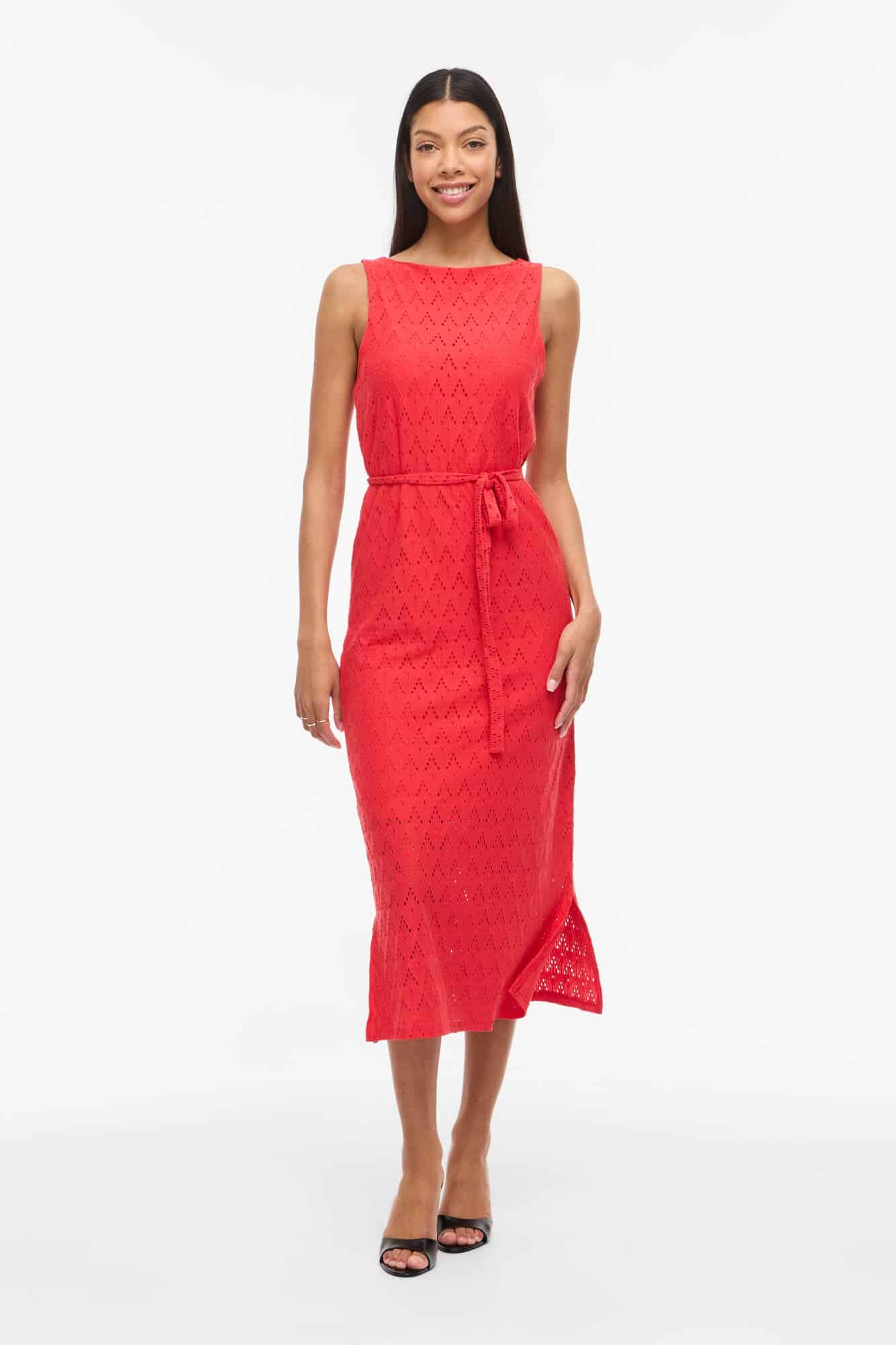 Viamalina kjolen fra Vila er designet med rund halsudskæring og en lige silhuet, der falder let langs kroppen. Det aftagelige bindebælte i taljen fremhæver figuren og giver mulighed for at tilpasse pasformen. Den midi længde og de små slidser i siden bidr