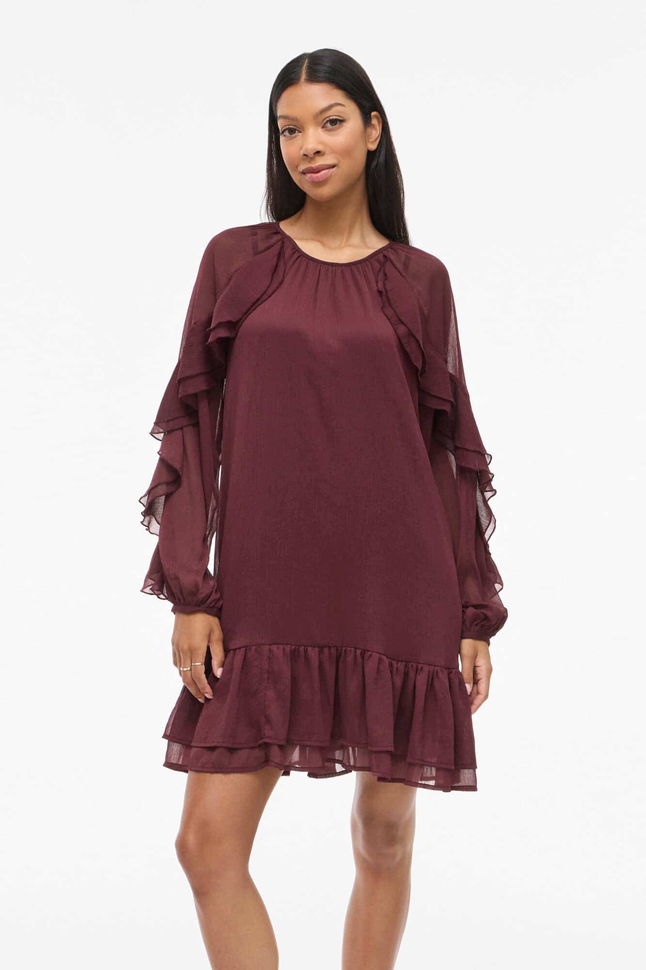 Denne bordeaux farvet kjole fra Vila har let gennemsigtige lange ærmer med flæser. Kjolen har knaplukning og flæser på nederste del af kjolen.