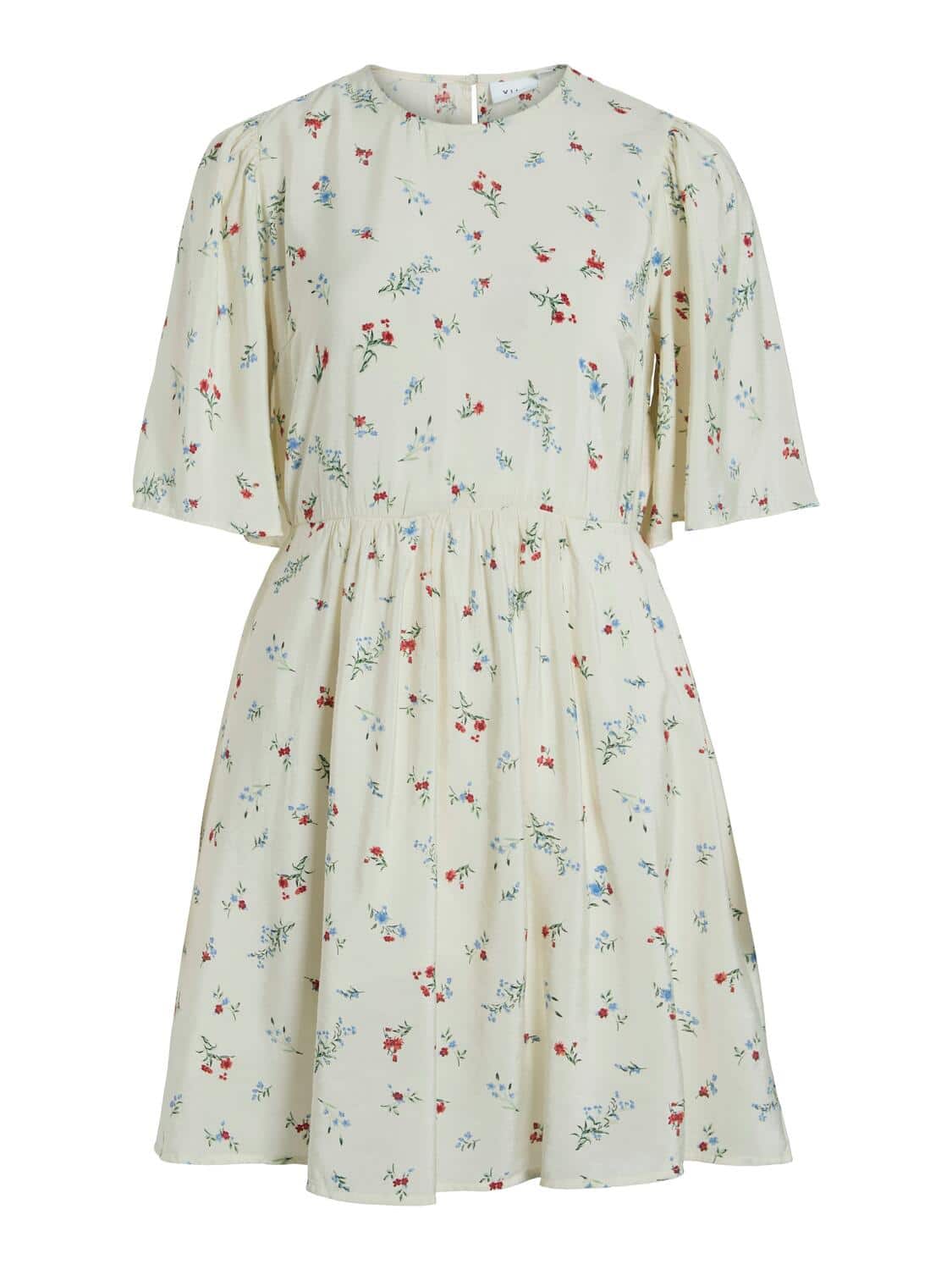 Denne vare udgår af sortiment og sælges til udsolgt. Vihavanne Rima kjolen fra Vila er en feminin kjole, der emmer af sommer og lethed. Den er fremstillet i en lys, cremet nuance og prydet med et sart blomsterprint i røde og blå toner. Kjolen har korte, l