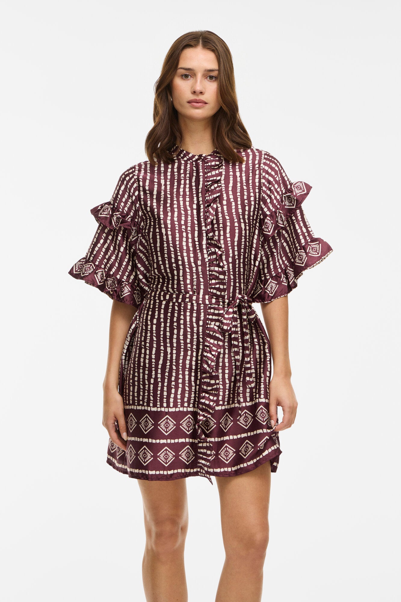 Denne feminine kjole med grafisk mønster og flæsedetaljer er fremstillet i en dyb bordeaux med cremefarvet kontrast. Kjolen har vidde ærmer med markante flæser og dekorative kantbånd samt knaplukning med flæsekant langs fronten og et bindebælte i taljen,