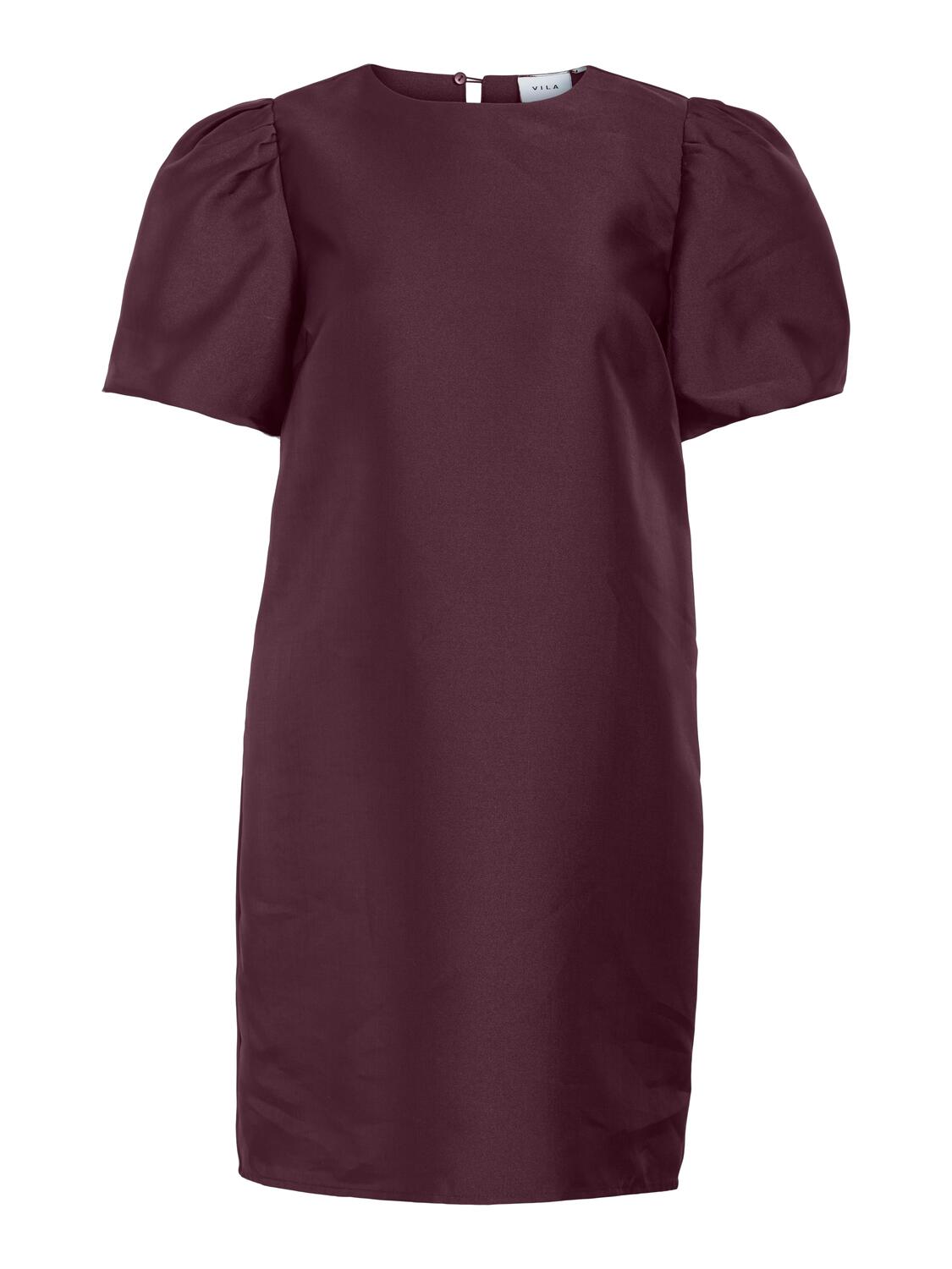 Enkelt og elegant kort kjole fra Vila i farven fig. Kjolen er designet med korte pufærmer, rund hals og lukkes bagpå med en enkel knap. Kjolen kan bruges til både hverdag og festlige begivenheder.
